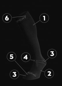 Çorabın geniş yan kenarı, sıkma ve turnike etkisini önlemeye yardımcı olur. Uç ve topuk kısmı optimum konfor ve sürtünme önleyici sistemler ile güçlendirilmiştir.